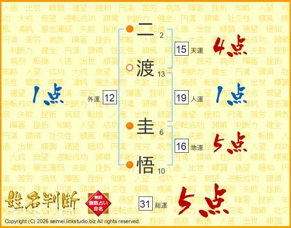 二(2画)渡(13画) 圭(6画)悟(10画)