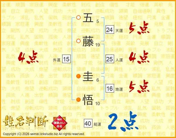 五(5画)藤(19画) 圭(6画)悟(10画)