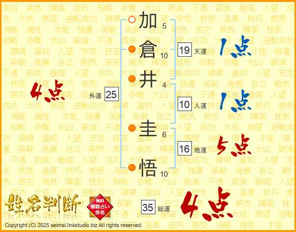 加(5画)倉(10画)井(4画) 圭(6画)悟(10画)