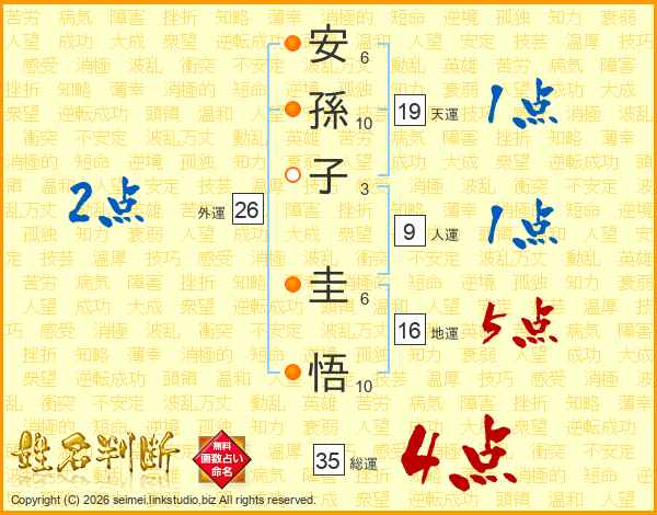 安(6画)孫(10画)子(3画) 圭(6画)悟(10画)