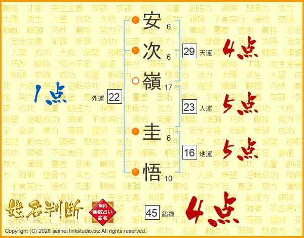 安(6画)次(6画)嶺(17画) 圭(6画)悟(10画)