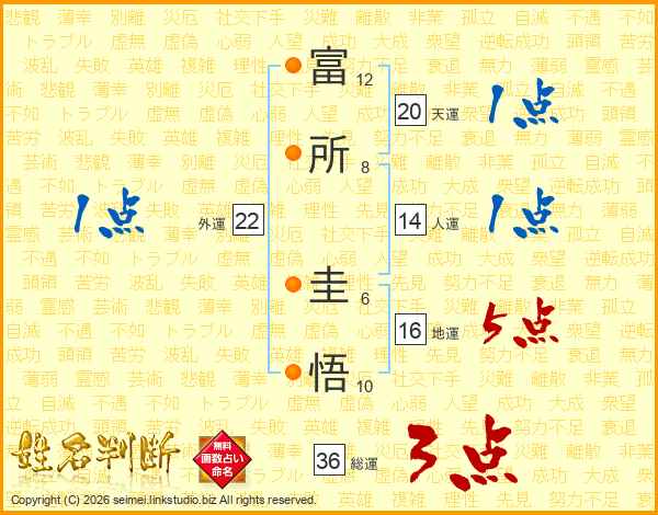 富(12画)所(8画) 圭(6画)悟(10画)
