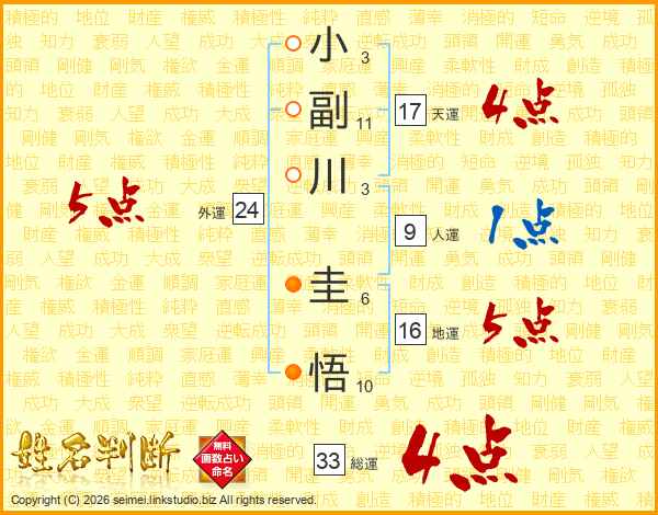 小(3画)副(11画)川(3画) 圭(6画)悟(10画)