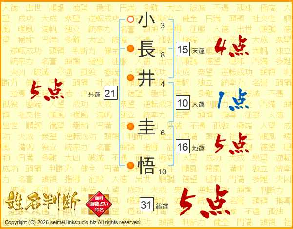小(3画)長(8画)井(4画) 圭(6画)悟(10画)