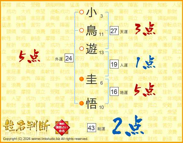 小(3画)鳥(11画)遊(13画) 圭(6画)悟(10画)