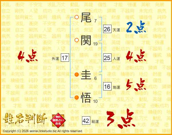 尾(7画)関(19画) 圭(6画)悟(10画)