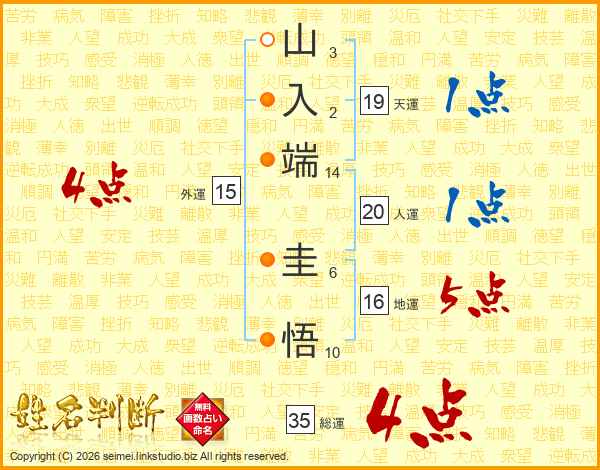 山(3画)入(2画)端(14画) 圭(6画)悟(10画)