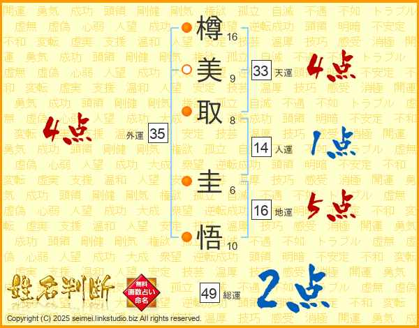 樽(16画)美(9画)取(8画) 圭(6画)悟(10画)