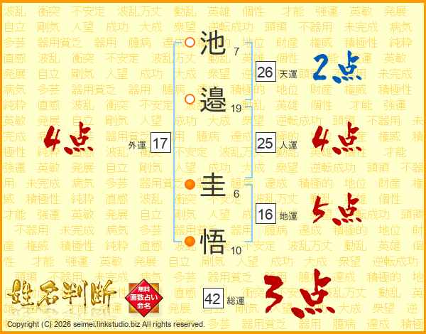 池(7画)邉(19画) 圭(6画)悟(10画)