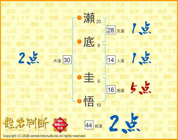 瀬(20画)底(8画) 圭(6画)悟(10画)
