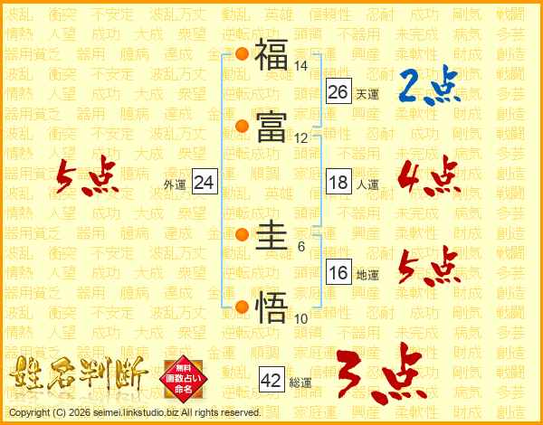 あなたの人生を表す1番重要な運勢です。生涯を通じて影響する総合運となり、主に50歳以降の晩年期に影響を及ぼします。苗字と名前の合計画数。