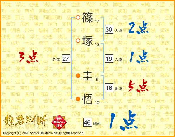 篠(17画)塚(13画) 圭(6画)悟(10画)