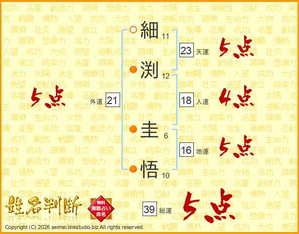 細渕圭悟さんの総運は39画の5点!