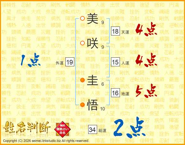 美(9画)咲(9画) 圭(6画)悟(10画)