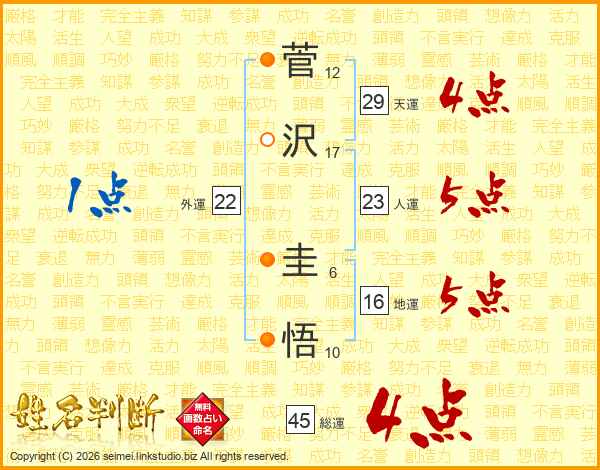 菅(12画)沢(17画) 圭(6画)悟(10画)
