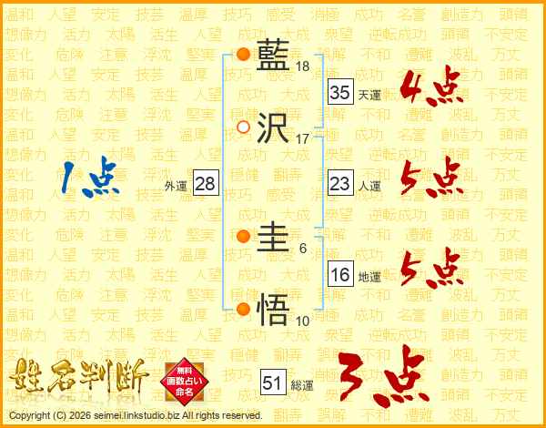 藍(18画)沢(17画) 圭(6画)悟(10画)