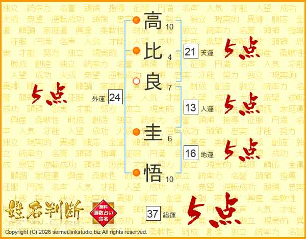 高(10画)比(4画)良(7画) 圭(6画)悟(10画)