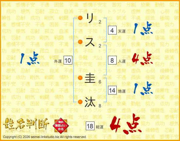 リ(2画)ス(2画) 圭(6画)汰(8画)