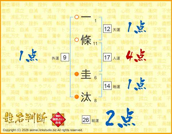 画数の奇数(○陽)と偶数(●陰)の配列で吉凶を占います。どちらかにかたよる名前は大凶名で避ける必要があります。画数の奇数偶数。