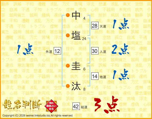 中(4画)塩(24画) 圭(6画)汰(8画)