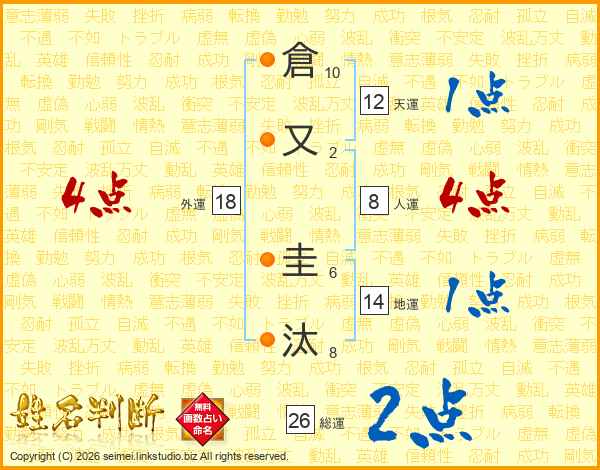倉(10画)又(2画) 圭(6画)汰(8画)