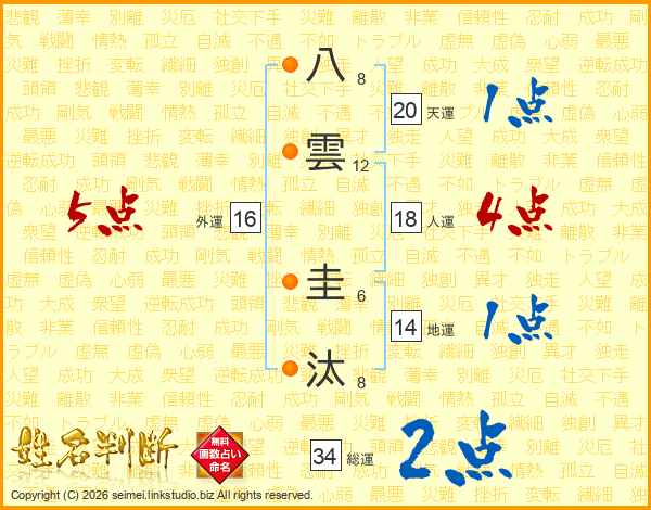 八(8画)雲(12画) 圭(6画)汰(8画)