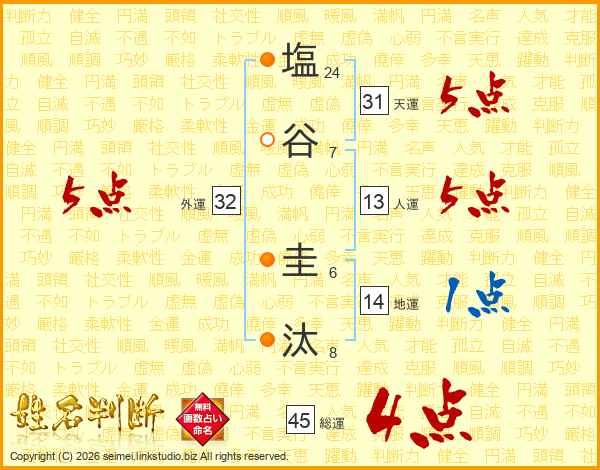 塩(24画)谷(7画) 圭(6画)汰(8画)