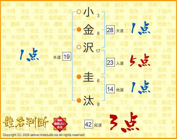 小(3画)金(8画)沢(17画) 圭(6画)汰(8画)