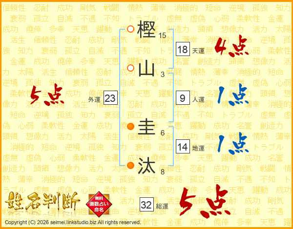 樫(15画)山(3画) 圭(6画)汰(8画)