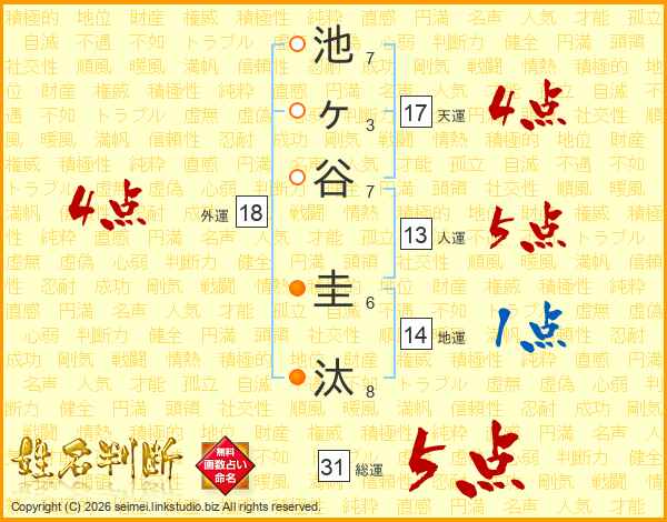 池ヶ谷圭汰さんの総運は31画の5点!