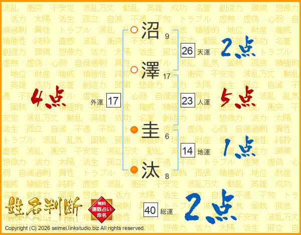 沼(9画)澤(17画) 圭(6画)汰(8画)