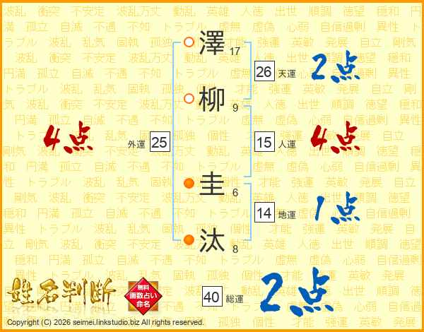 澤(17画)柳(9画) 圭(6画)汰(8画)