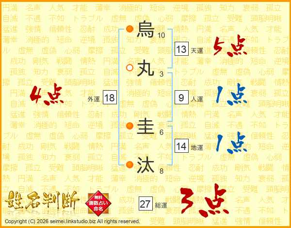 烏(10画)丸(3画) 圭(6画)汰(8画)