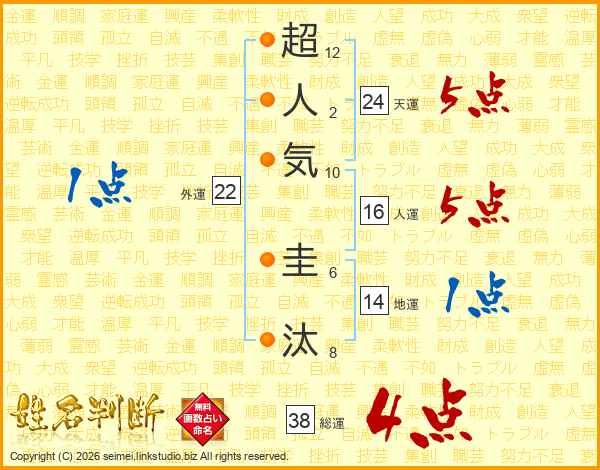 超(12画)人(2画)気(10画) 圭(6画)汰(8画)
