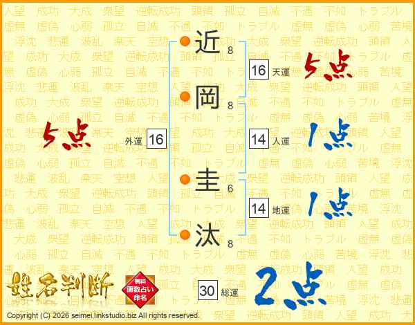近(8画)岡(8画) 圭(6画)汰(8画)