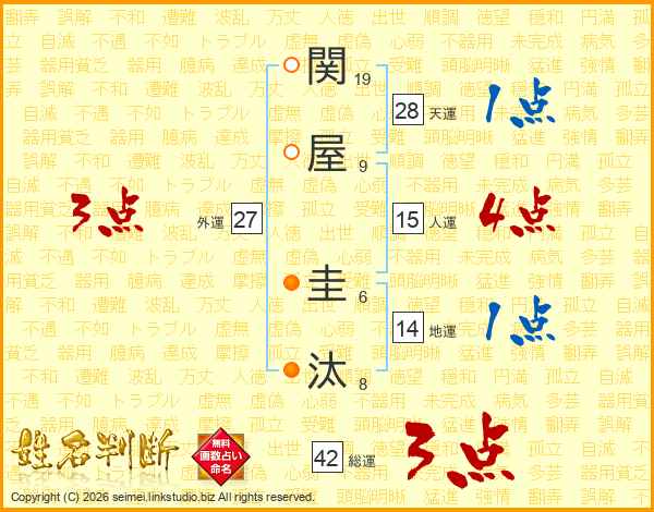 関(19画)屋(9画) 圭(6画)汰(8画)