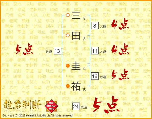 あなたの人生を表す1番重要な運勢です。生涯を通じて影響する総合運となり、主に50歳以降の晩年期に影響を及ぼします。苗字と名前の合計画数。