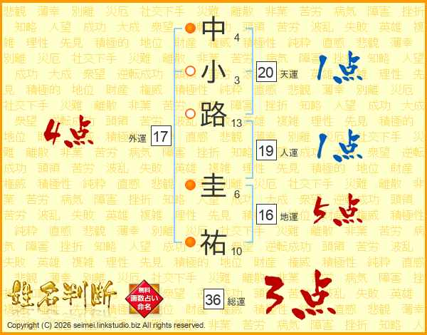 中(4画)小(3画)路(13画) 圭(6画)祐(10画)