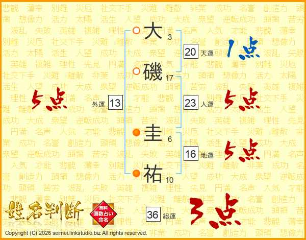 大(3画)磯(17画) 圭(6画)祐(10画)
