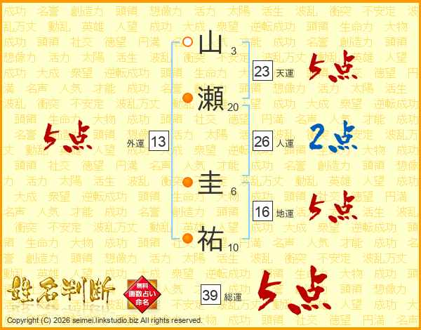 山瀬圭祐さんの天運は23画の5点!