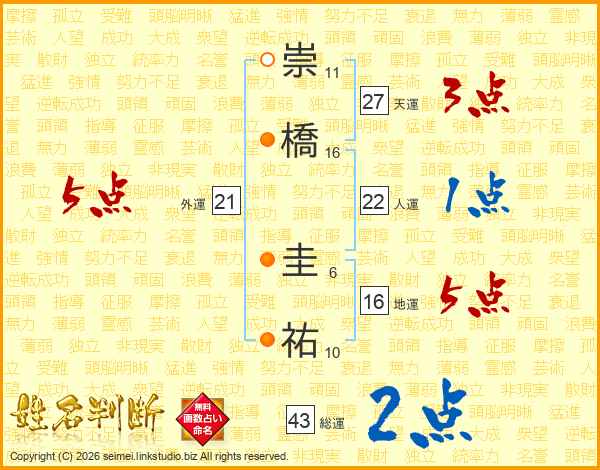 崇(11画)橋(16画) 圭(6画)祐(10画)