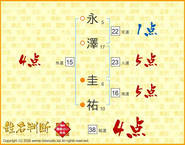 永(5画)澤(17画) 圭(6画)祐(10画)