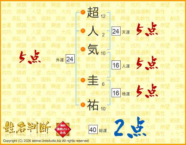 超(12画)人(2画)気(10画) 圭(6画)祐(10画)
