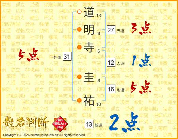 道明寺圭祐さんの総運は43画の2点!