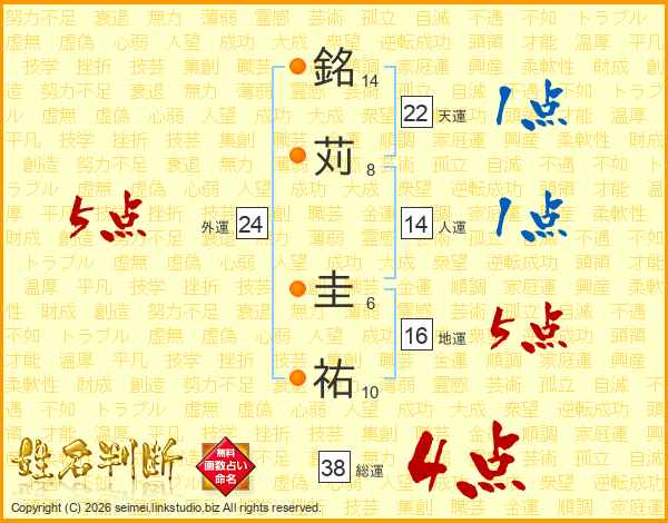 銘(14画)苅(8画) 圭(6画)祐(10画)