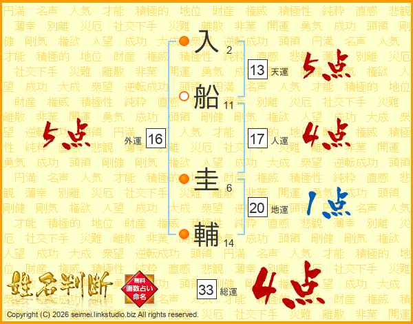 生活面を象徴する運勢です。外部から受ける影響力を表し、結婚運、家庭運や職場、環境への順応性を表します。総運から人運を引いた画数。姓や名が1文字の場合を除く。