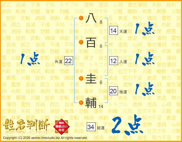 生活面を象徴する運勢です。外部から受ける影響力を表し、結婚運、家庭運や職場、環境への順応性を表します。総運から人運を引いた画数。姓や名が1文字の場合を除く。