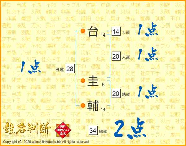 生活面を象徴する運勢です。外部から受ける影響力を表し、結婚運、家庭運や職場、環境への順応性を表します。総運から人運を引いた画数。姓や名が1文字の場合を除く。