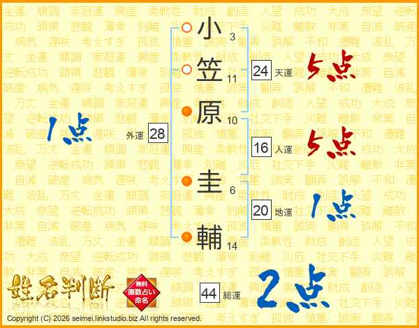 小(3画)笠(11画)原(10画) 圭(6画)輔(14画)
