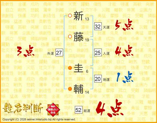 新藤圭輔さんの総運は52画の4点!